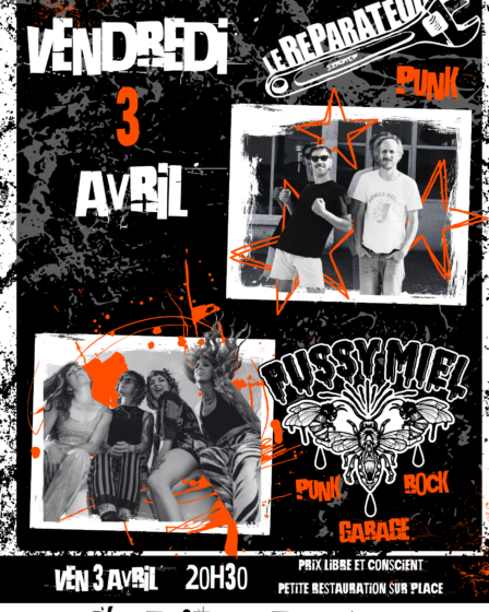 On compte bien sur TOI pour faire trembler les murs du café pour la soirée sûrement la plus PUNK de l’année ! avec les étoiles montantes du moment de la scène punk/rock/garage !! Les PUSSY MIEL et le son punk à grande gueule du RÉPARATEUR !!
