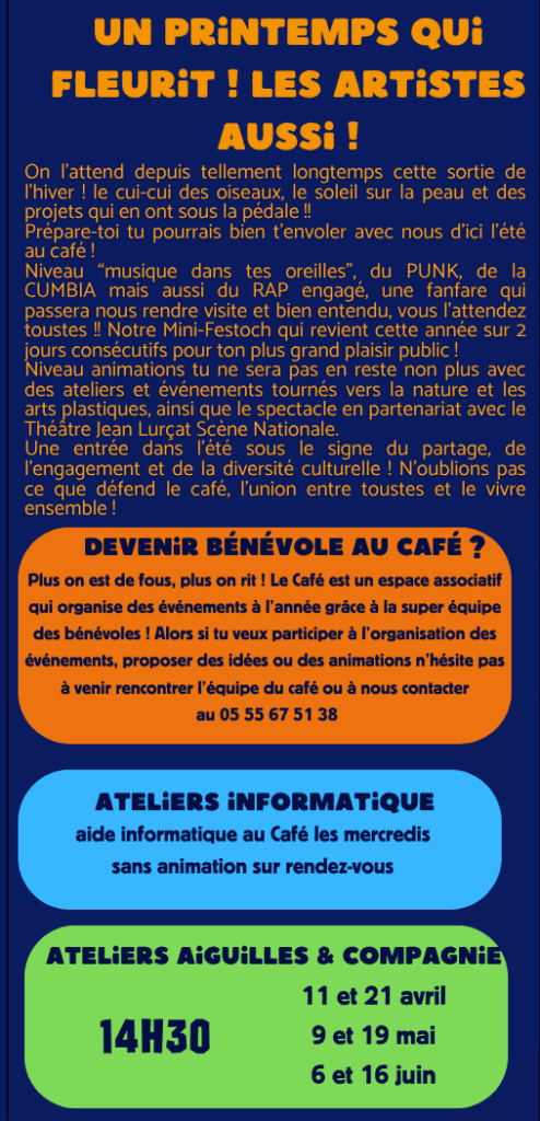 Le café est identifié comme un lieu de ressources pour les activités, les acteurs et les événements qui se déroulent sur notre territoire. Avec une équipe de bénévoles solides, un conseil d’administrations dynamique, la structure propose des événements tout au long de l’année.