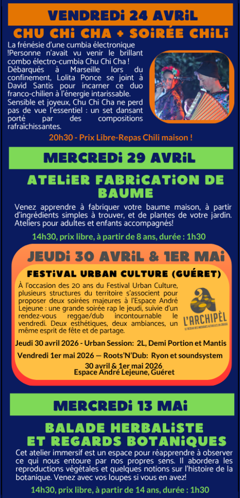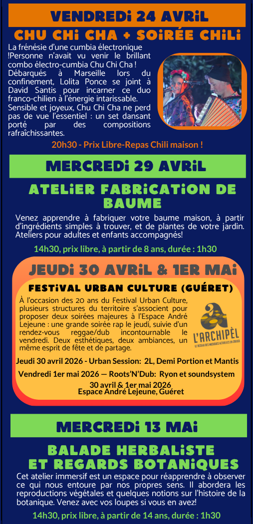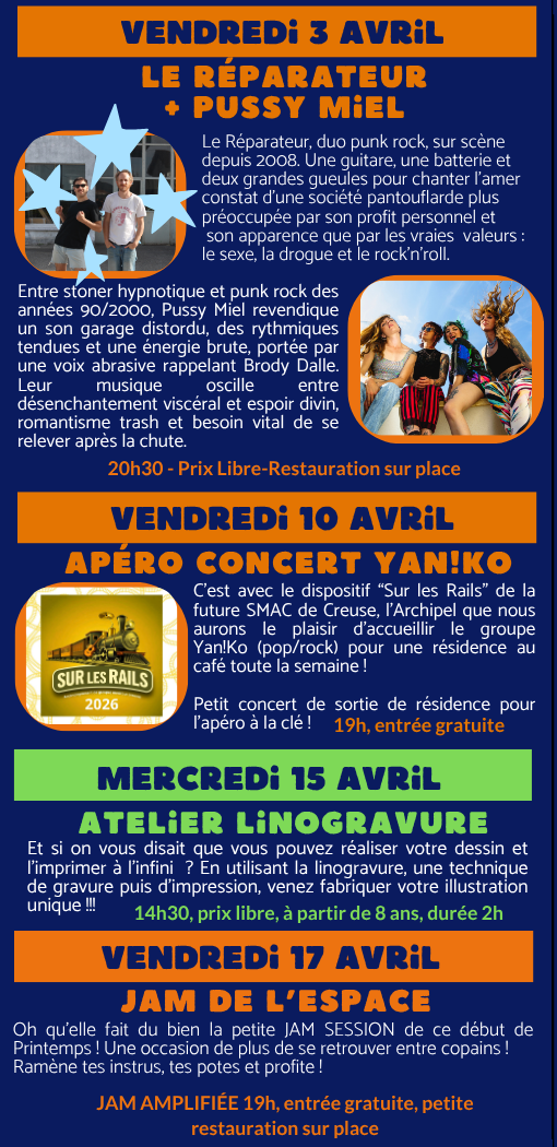 Véritable lieu hybride en milieu rural, labellisé « Espace de Vie Sociale » et membre de L’Archipèl (développement des Musiques Actuelles en Creuse), le Café de l’Espace propose de nombreuses activités socio-culturelles: