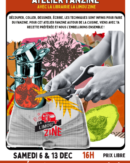 Samedi 6 décembre à 16h Atelier Fanzine avec notre librairie préférée la Librairie La Limou’Zine Découper, coller, dessiner, écrire, les techniques sont infinis pour faire du fanzine. Pour cet atelier fanzine autour de la cuisine, viens avec ta recette préférée et nous l’embellirons ensemble ! Prix libre, tous publics (atelier en deux parties, l’inscription vaut …