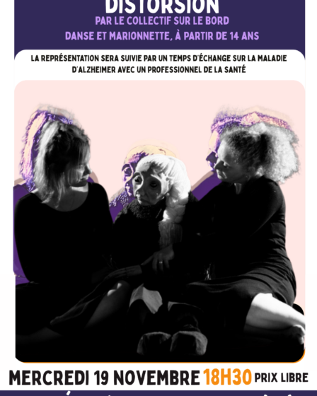 Mercredi 19 novembre à 18h30 Spectacle Distorsion par le Collectif Sur le Bord « Mamie Fernande a aujourd’hui 82 ans. Elle aime tricoter et danser la vie. Mais la vie disparait. Des moments, des instants, des fragments, des bouts de soi, d’elle, que nous essayons au mieux de rattraper pour qu’elle ne perde pas le fil, …