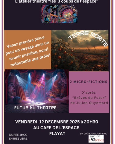 Vendredi 12 décembre à 20h30Soirée théâtre au Café de l’Espace Et si les terres agricoles devenaient infertiles ? Si l’on transformait les théâtres en réserves ?Après » Amitié Marchande* »,(présenté en juin dernier) l’atelier théâtre « LES 3 COUPS DE L’ESPACE » vous convie à nouveau à un voyage dans un avenir aussi redoutable que drôle avec « Terre …