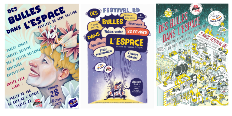 Le désormais célèbre festival de BD unique en Creuse est de retour en 2026 pour la 4ème édition. Cette année, le festival des Bulles dans l’Espace se tiendra le 27 et le 28 février et le programme est immanquable. Soirée d’ouverture le vendredi 27 février en fin d’après-midi à la médiathèque de Felletin et rencontre avec Aude Mermilliod, l’invitée d’honneur de cette édition. Le samedi 28 février à partir de 10h, au Café de l’Espace à Flayat. La journée s’organisera entre les expositions, les dédicaces et les tables rondes des onze auteur.ices présent.es : Agnès Debacker, Jika, Otto.T., Fano Loco, Lénon, Silki, Robin Cousin, Allan Barte, Mathieu Sapin, Aude Mermilliod. L’évènement se clôturera en soirée avec le concert dessiné de Benjamin Flao et Watchdog. Toujours une entrée à prix libre et conscient et petite restauration. Programme détaillé prochainement sur Facebook et Instagram @desbullesdanslespace